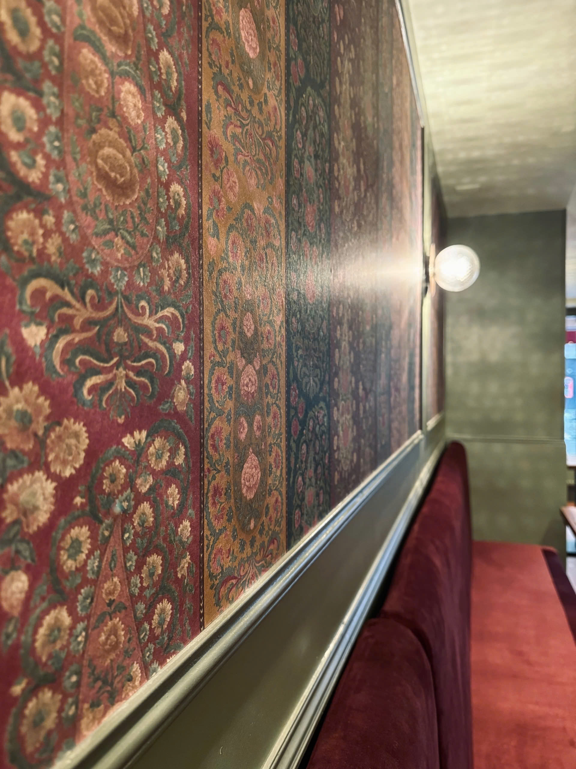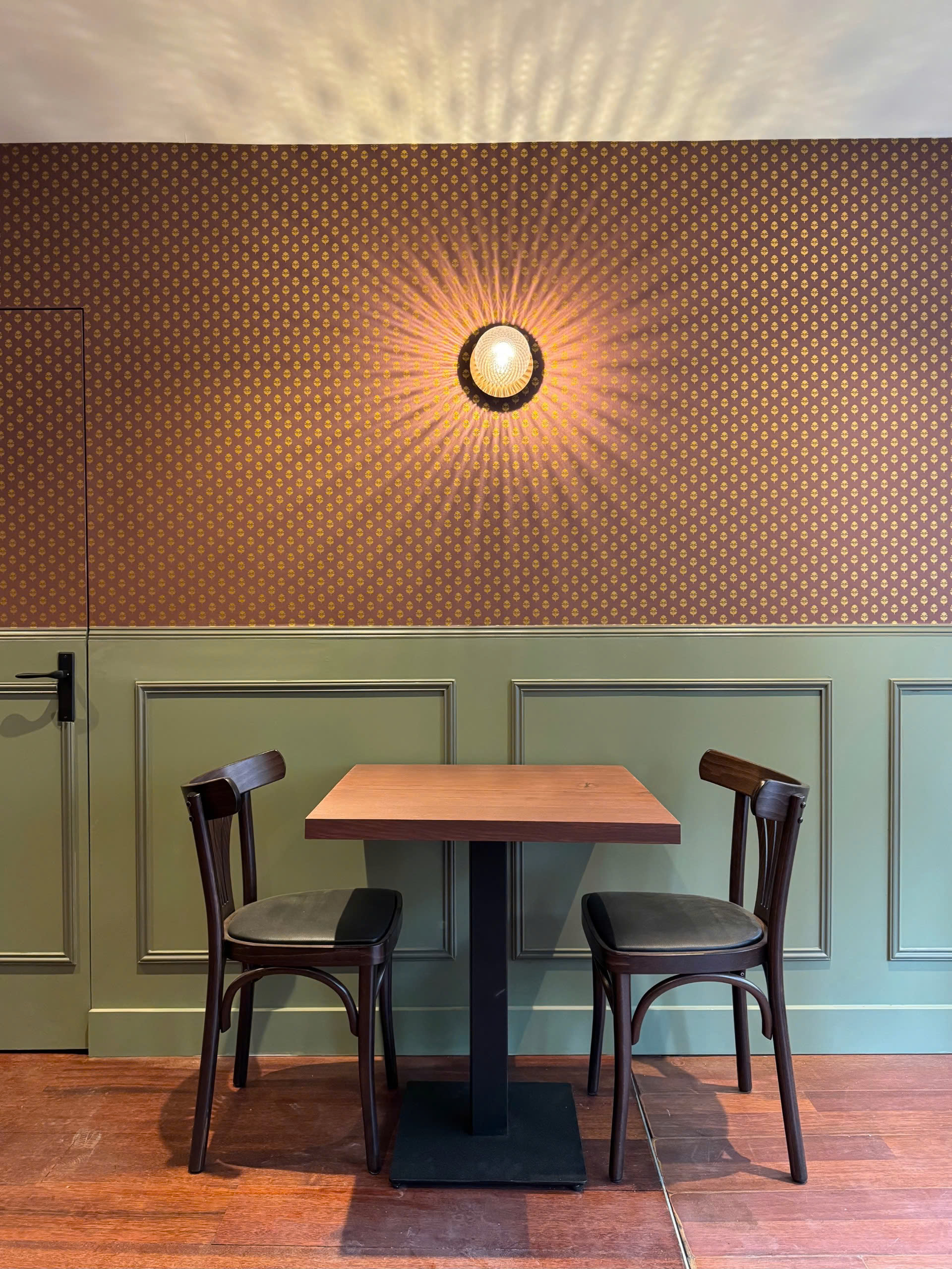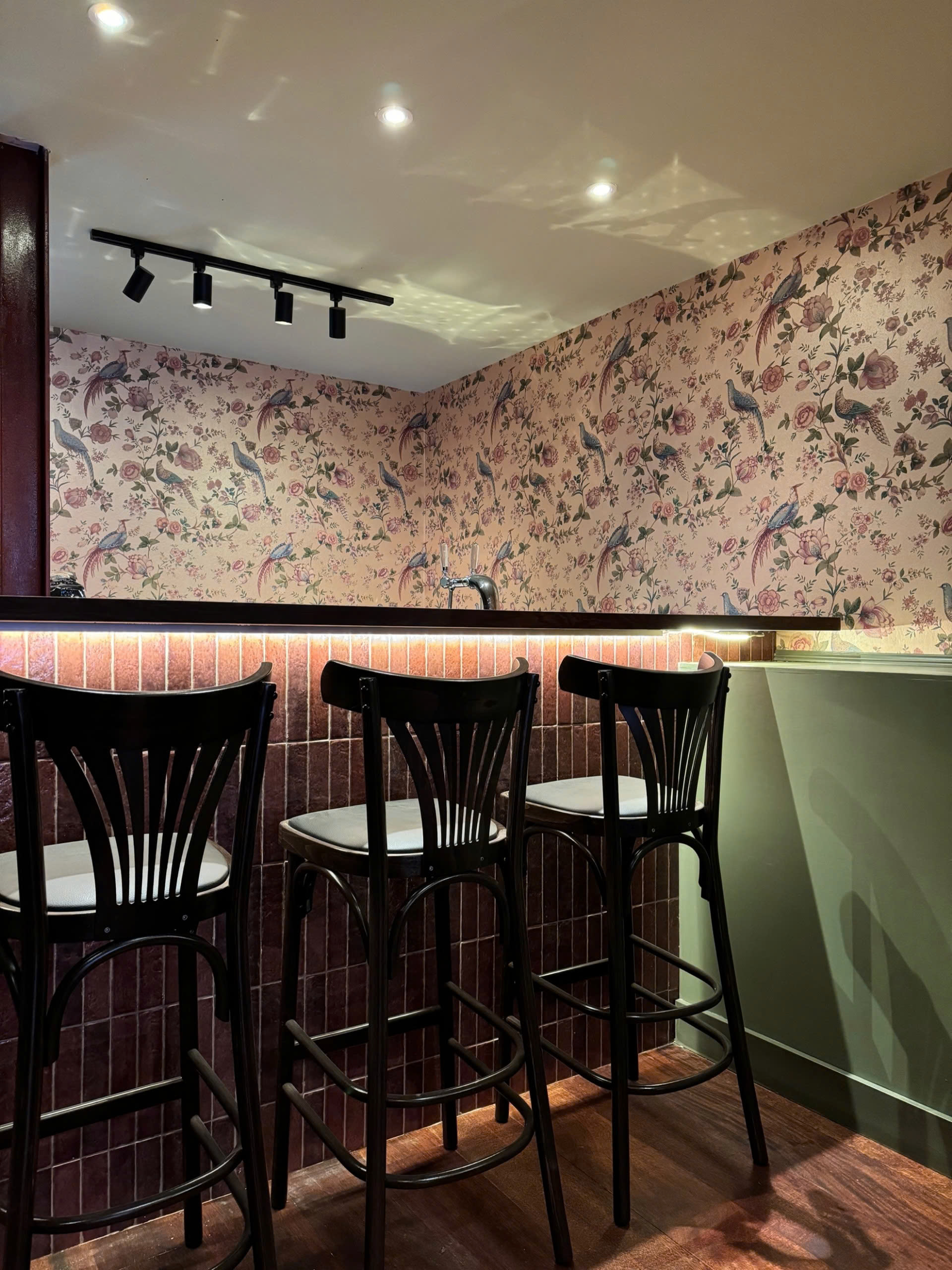 Het restaurant moest met een strak budget getransformeerd worden van een streetfood vibe naar een elegante en uitnodigende ambiance met een duidelijke traditionele Indiase touch. Om grootste impact te maken met een niet te hoge prijs heb ik ervoor gekozen om alle muren te behangen met behang uit India en gekozen voor typisch Indiase kleuren. De harde bank is vervangen door een zachtere bank in een rijke velvet en we hebben een gezellige bar gecreerd met mooie tegels en luxe behang met een glansje. De walnoten houten tafels en Thonet stoelen moeten het gevoel geven van de oude cafes in Mumbai.